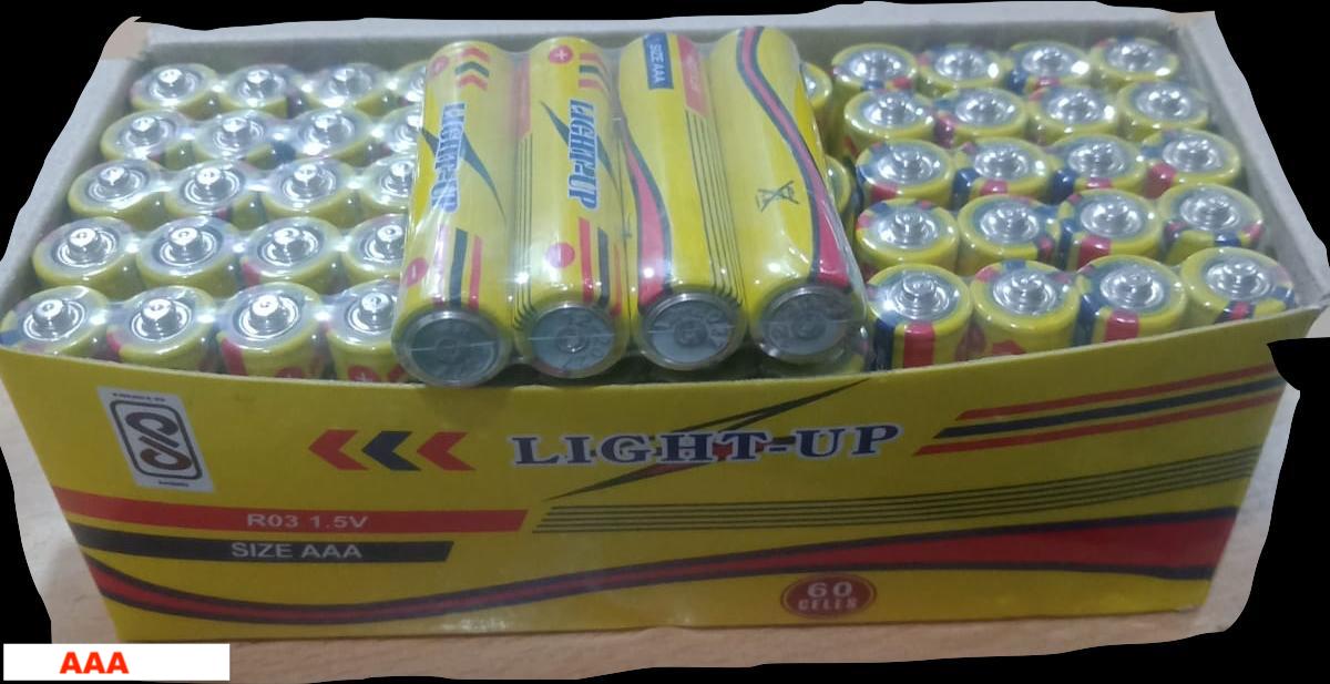 A large box of yellow AAA (R03) 1.5V LIGHT-UP batteries, neatly packed in bulk (60 pieces), suitable for toys, remotes, and small electronic devices.